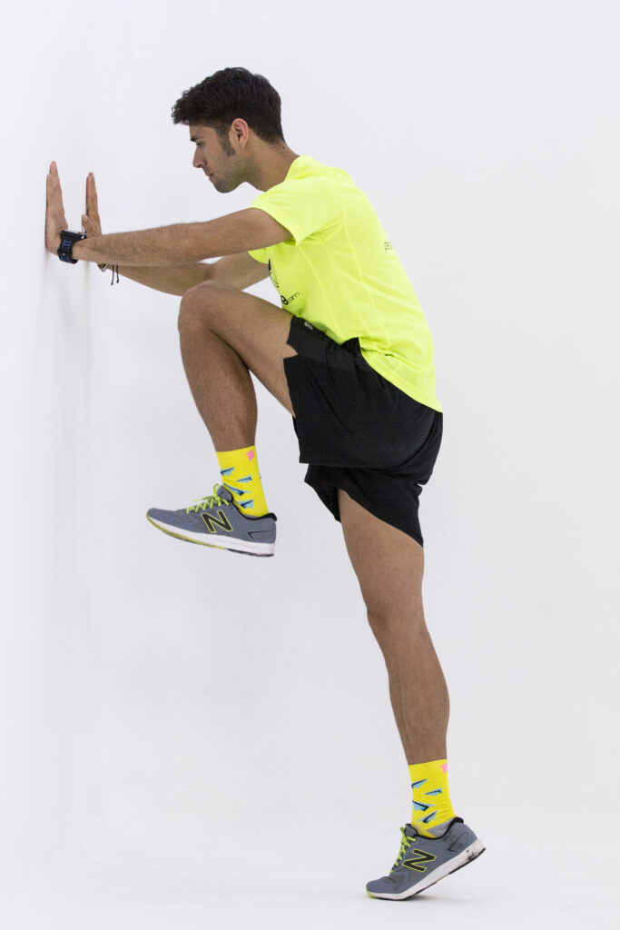3. Ejercicios específicos de técnica de carrera (5′). A continuación, pinchando en los nombres, puedes ver videos de ejercicios específicos: Talonamiento con rodilla arriba; Saltos talón-punta; Skipping alto; Talón a glúteo acabando en carrera.