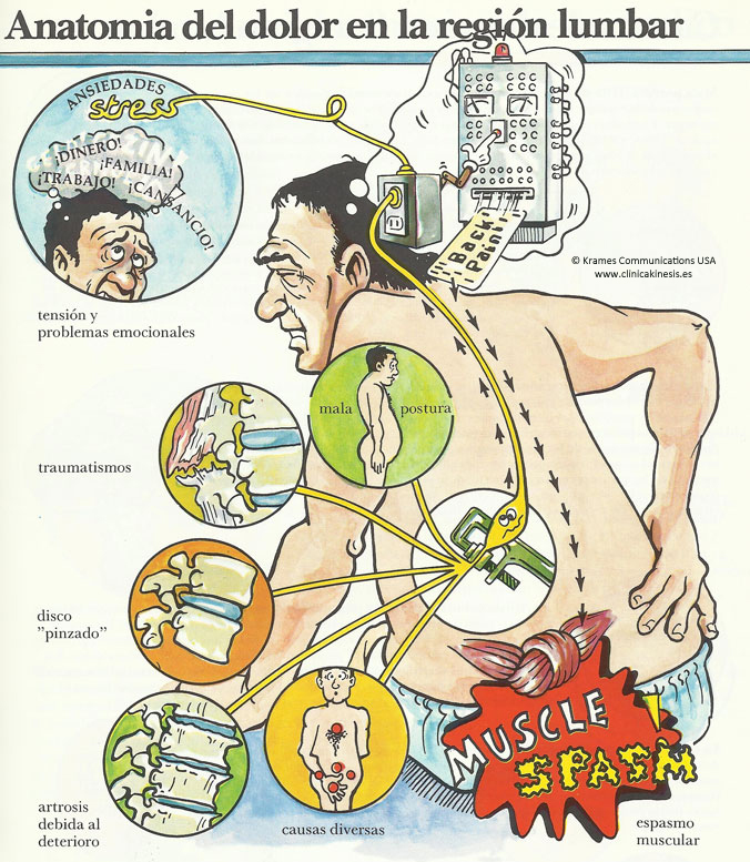 La lumbalgia puede ser provocada por diversos factores, explicados de una manera sencilla en la siguiente imagen, entre los cuales se encuentran el estrés, las malas posturas o los traumatismos.